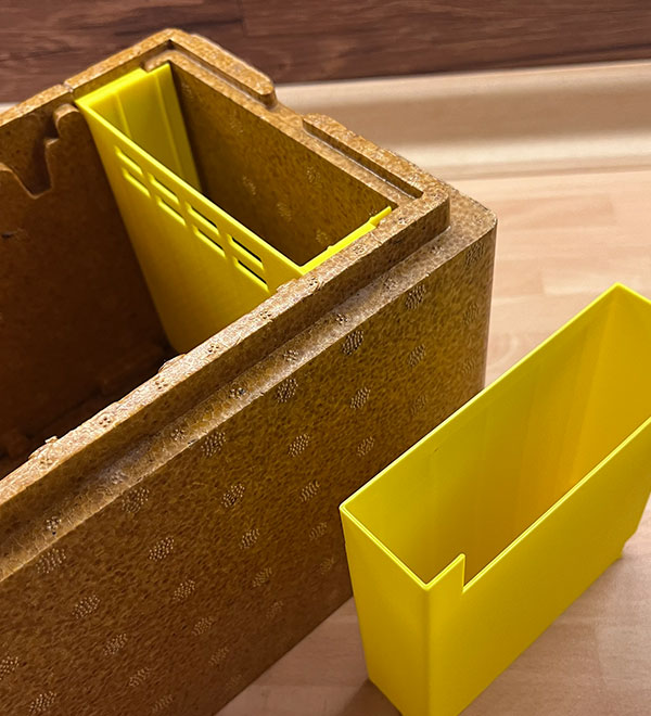 Die schmale Futterbox ersetzt den Standard Futtertrog und bietet Platz für ein zusätzliches Rähmchen (im Preis enthalten). Passend für APIDEA und MiniApi EPP Begattungskästen. Durch die Trennwand bleibt der Futtertrog von der Königin getrennt und kann problemlos gewechselt werden.